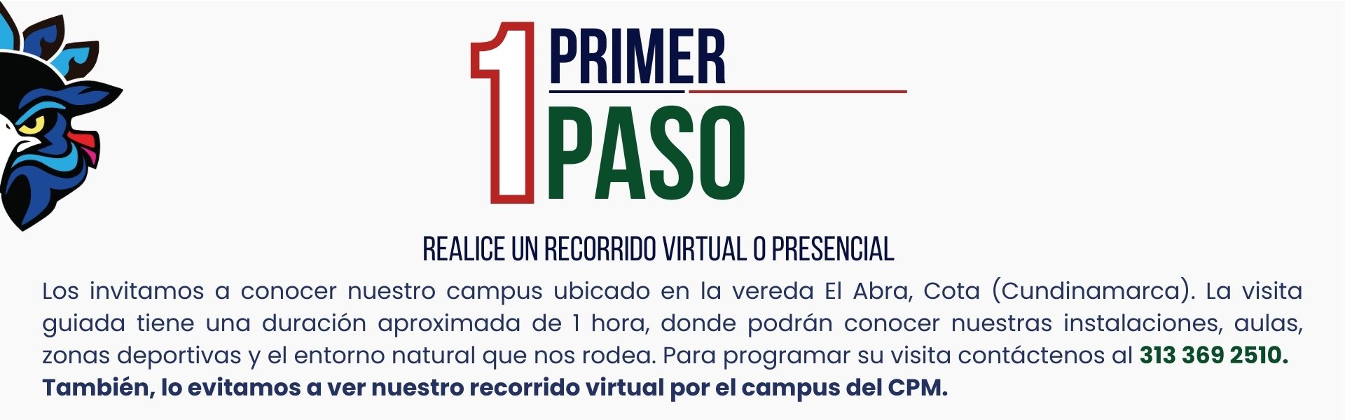 Los invitamos a conocer nuestro campus ubicado en la vereda El Abra, Cota (Cundinamarca). La visita guiada tiene una duración aproximada de 1 hora, donde podrán conocer nuestras instalaciones, aulas, zonas deportivas y el entorno natural que nos rodea. Para programar su visita, por favor, contactarnos al 313 3692510