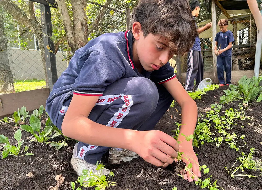 Aquí, nuestros estudiantes siembran, cultivan y observan los procesos de la tierra mientras aprenden sobre sostenibilidad, responsabilidad y trabajo colaborativo.